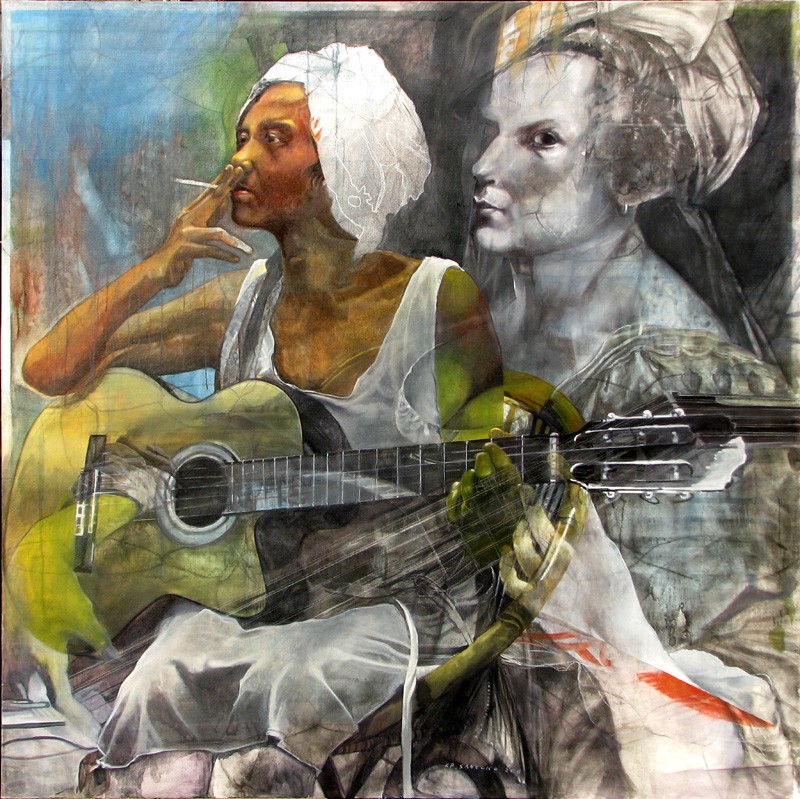 by Valerie C. Doran ©2012 Born in Nganjuk East Java in 1974, Kokok studied painting at the Indonesia Institute of the Arts, Yogyakarta (Institut Seni Indonesia). Throughout his artistic practice Kokok has been deeply dedicated to exploring the possibilities of the painting surface through the dissection and intersection of forms and colour, often reducing the image of a concrete object such as an apple or a flower to its most essential planes: in a sense a kind of ‘abstract realism’. In a recent experiment with installation Kokok even attempted to incorporate real human figures within a three-dimensional space into a ‘painting plane’ through the use of a kind of mathematically deduced illusion. In his recent paintings Kokok pushes his explorations further, in an attempt to create a visual, two-dimensional mapping of the multidimensional gradients of the psyche. The juxtaposed images in these atmospheric, gorgeously coloured paintings, rendered in varying degrees of concreteness and translucence, comprise a kind of virtual world of memories, perceptions and impressions of the past, the present and the future. This approach is compellingly evident in recent paintings such as Aku Mendut, executed in oils, charcoal and pencil on canvas, in which the image of a rough-looking Javanese street singer (and possible prostitute) playing a guitar is accompanied by the ghostly classical figure of a western woman playing the lute, appropriated from a painting by the Italian Baroque-period artist Artemisia Gentileschi (1593-1652). Gentileschi’s own history as a strong female figure--a successful artist at a time when few women were accepted as such, and also a victim of rape who prosecuted her attacker—seems to be part of the layered psychological narrative of this work, a kind of visual palimpsest in which time, space and memory are simultaneously revealed and compressed.