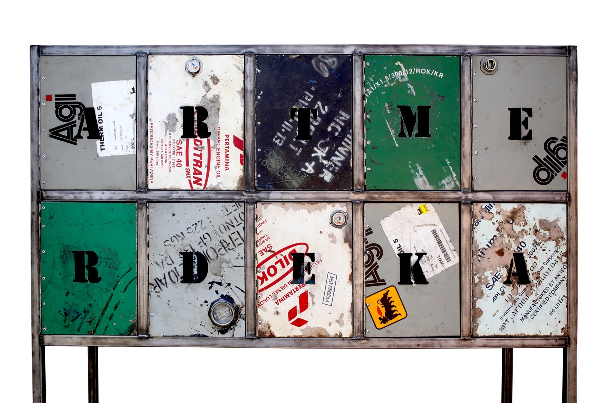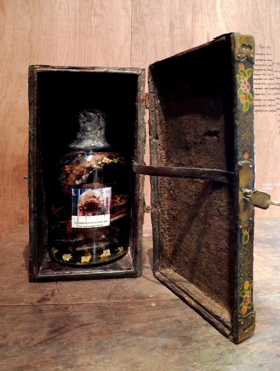 found pine cabinet, bronze, bamboo, found book, wax, leaves